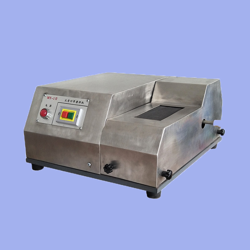 MY-1型光谱砂带磨样机的工作原理。电机主轴上安装带橡胶的大滚筒,带动经砂带连接的从动小滚筒,在电机的驱动下砂带作直线运动,将磨样放在砂带上即可进行试样的磨削以满足光谱测量对试样的要求。
